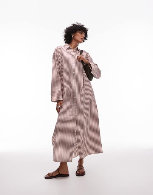ARKET – Maxi-Hemdblusenkleid aus reiner Baumwolle in Braun gestreift mit Seitenschlitz und Ärmeln mit Einsätzen