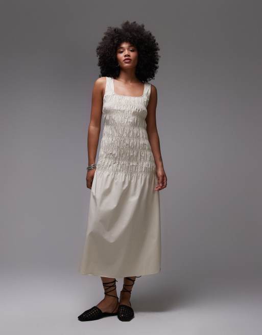 ARKET – Midikleid in Beige mit hohem Baumwollanteil, gesmoktem Oberteil und tiefer Taille