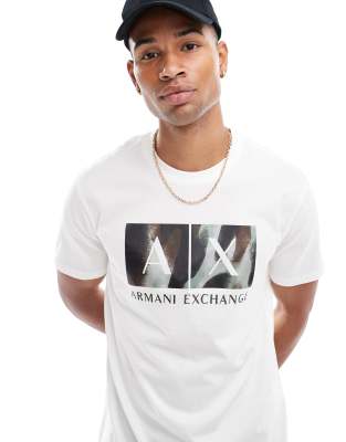 Armani Exchange – T-Shirt in Weiß mit Logoprint in Camouflage-Optik auf der Brust