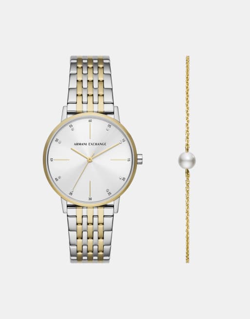 Armani Exchange – Zweifarbiges Set aus Edelstahl in Gold-Silber, aus Uhr mit drei Zeigern und Armband