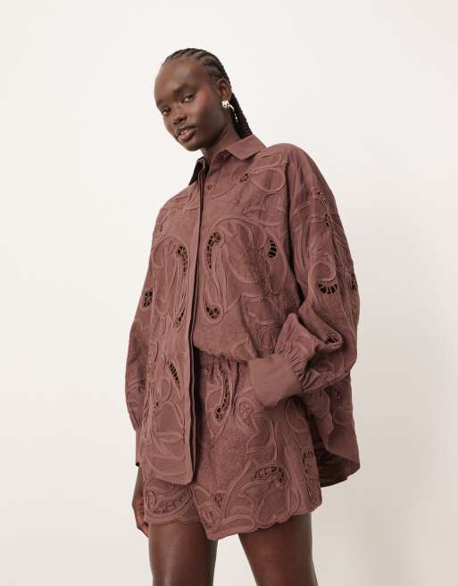 ARRANGE – Baumwoll-Shorts in Schokobraun mit symmetrisch besticktem, floralem Durchbruchmuster, Kombiteil