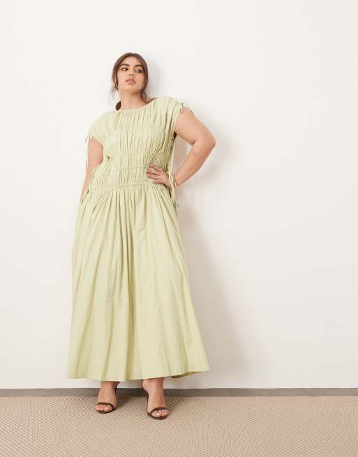 ARRANGE Curve – Ausgestelltes Midikleid aus Baumwolle in verwaschenem Salbeigrün mit Kordelzug und Taschen