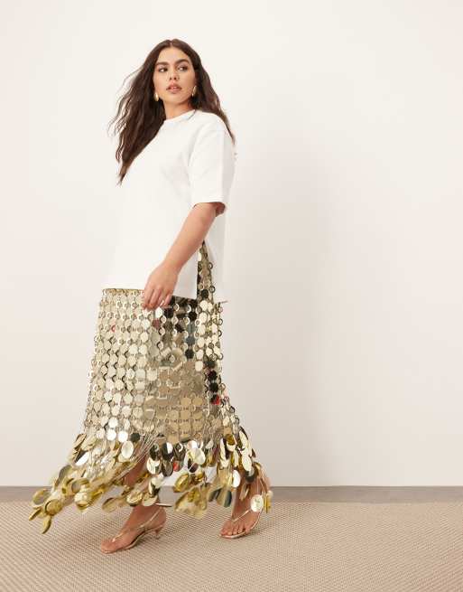 ARRANGE Curve – Futuristischer Midirock in Gold mit Paillettenverzierung und Fransensaum
