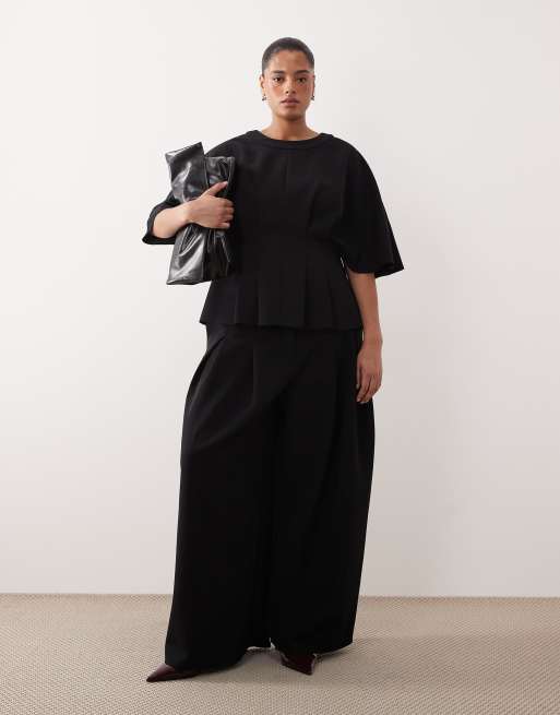 ARRANGE Curve – Kurzärmliges Oberteil mit plissierter Taille und elegante, weit geschnittene Hose in Schwarz