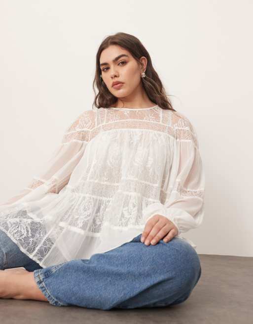 ARRANGE Curve – Oberteil in Weiß mit Spitzendetails, Blousonärmeln und Kordelzug
