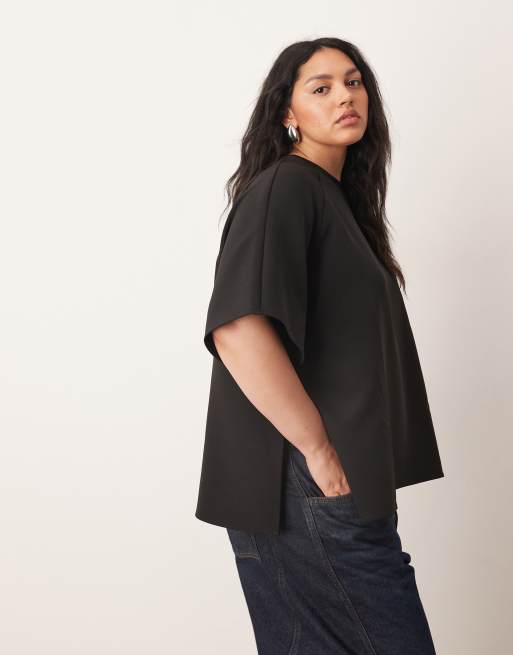 ARRANGE Curve – Schweres T-Shirt aus Crepe in Schwarz mit geripptem Ausschnitt