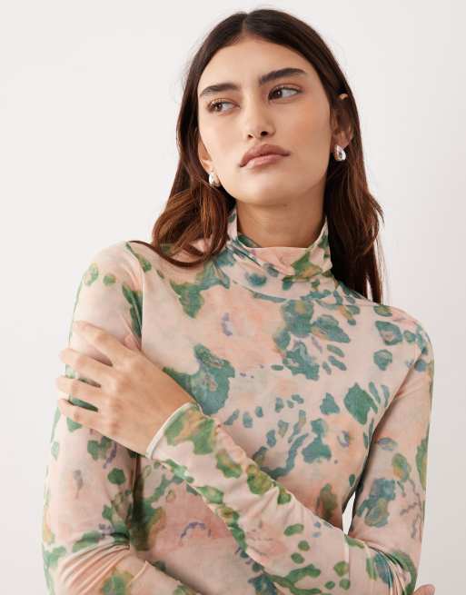ARRANGE – Hochgeschlossenes, langärmliges Oberteil aus hochwertigem Netzstoff in Rosa mit abstraktem Blumenmuster