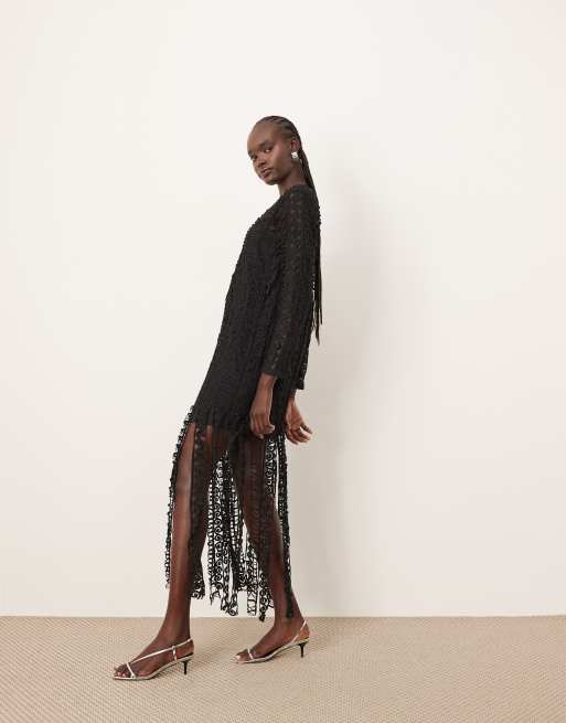 ARRANGE – Langärmliges Midikleid in Schwarz mit Spitzenstickerei und Fransensaum