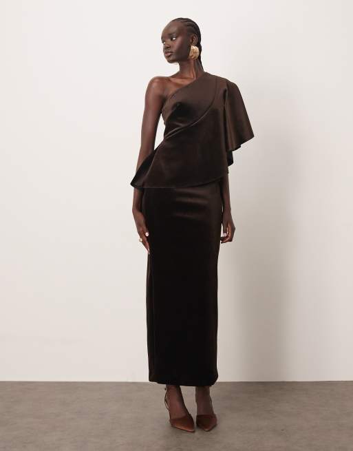 ARRANGE – Maxikleid aus Samt in Schokobraun mit One-Shoulder-Oberteil