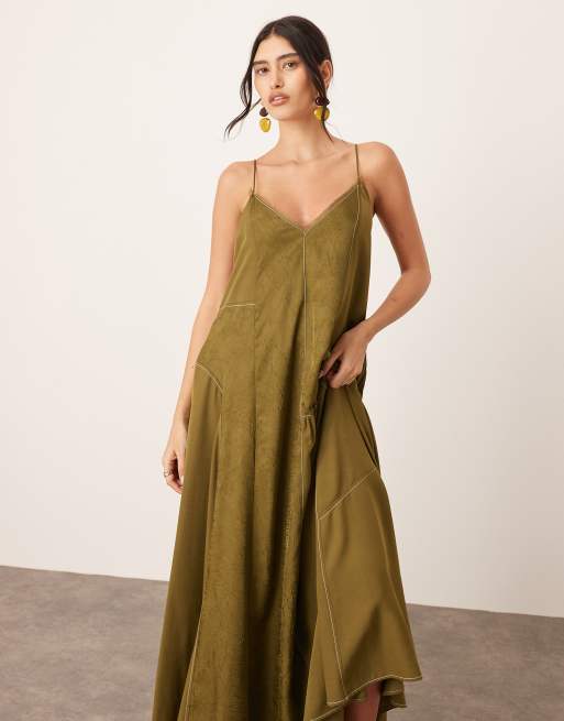 ARRANGE – Midi-Trägerkleid aus Satin-Mix in Olivgrün mit Knitterstruktur und ungesäumten Kanten