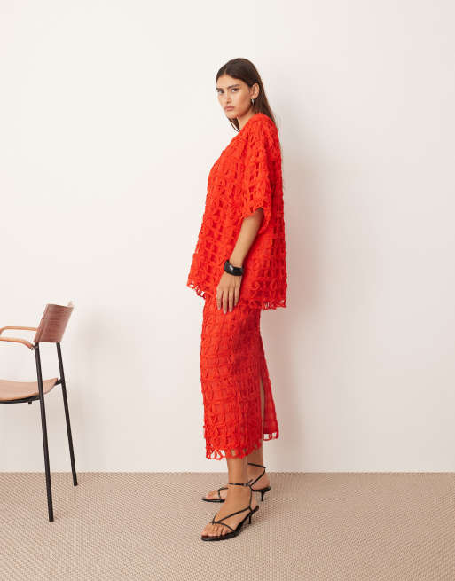 ARRANGE – Oversize-T-Shirt und gerade geschnittener Midirock in Rot mit floralem Lochmuster