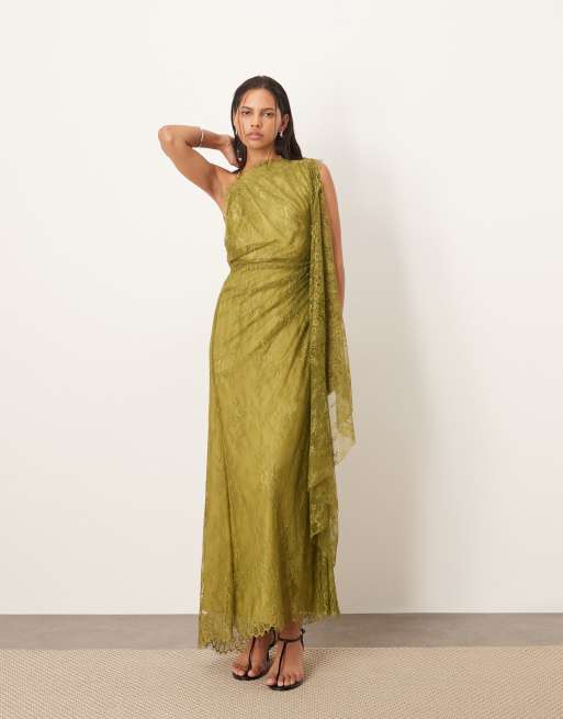 ARRANGE – Rückenfreies, drapiertes Maxikleid aus Spitze in Oliv mit Muschelsaum