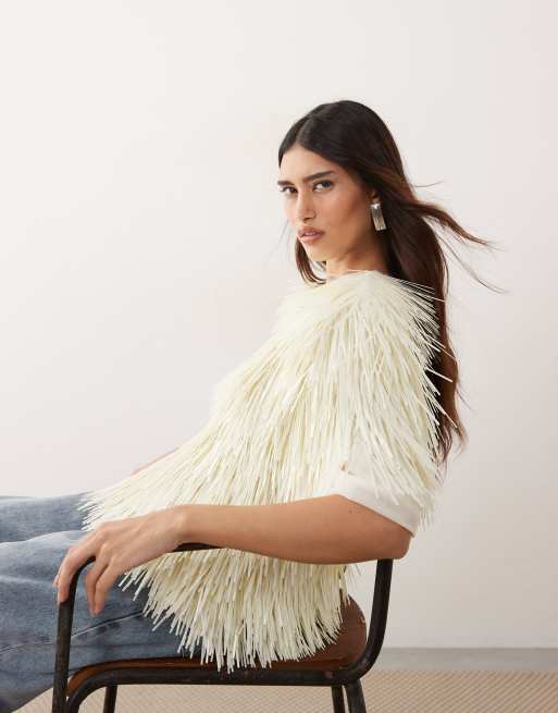 ARRANGE – T-Shirt in Weiß mit durchgehendem Pailletten-Splittern und verstärkter Schulterpartie