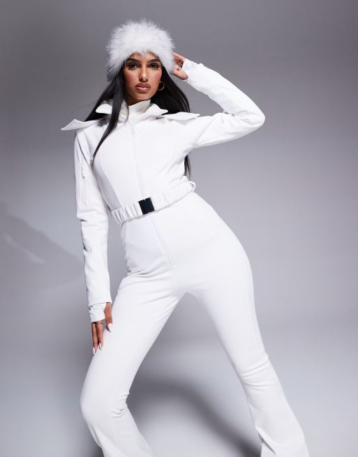 4505 – Ski – Skianzug in Weiß mit schmalem, ausgestelltem Bein, Gürtel und Kapuze mit Kunstpelzbesatz