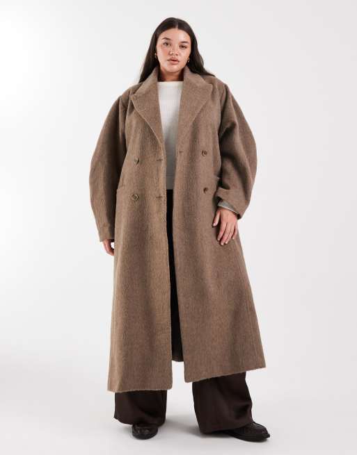 ASOS DESIGN Curve – Angerauter Mantel in Pilzbraun mit Kuppelärmeln und schmalem Gürtel