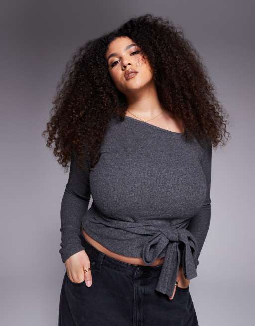 ASOS DESIGN Curve – Angerautes, langärmeliges Oberteil in Anthrazit mit asymmetrischem Ausschnitt und Bindedetail in der Taille