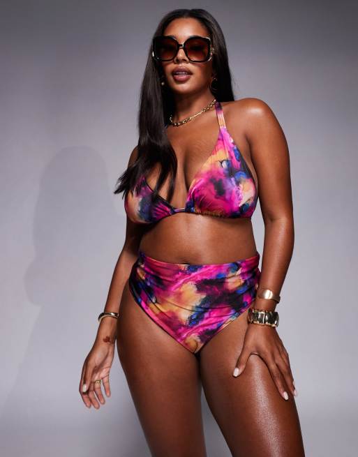 ASOS DESIGN Curve – Arina – Bikinihose in Rosa mit hohem Beinausschnitt, hohem Bund und abstraktem Muster