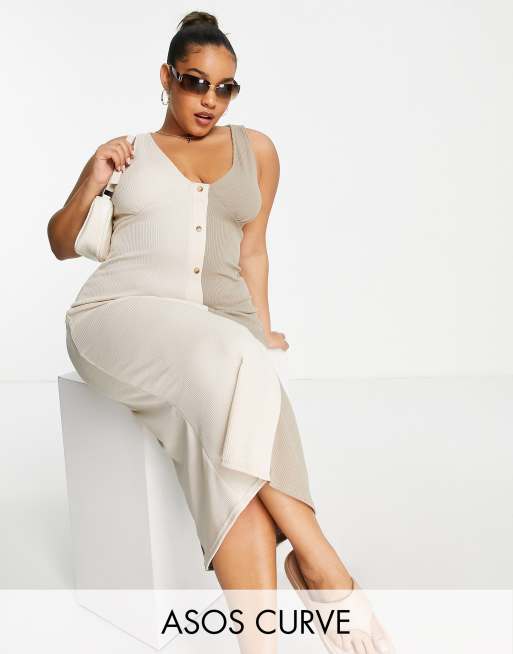ASOS DESIGN Curve – Ärmelloses, geripptes Midikleid mit Farbblock-Design in neutralen Creme-Tönen und Knopfleiste