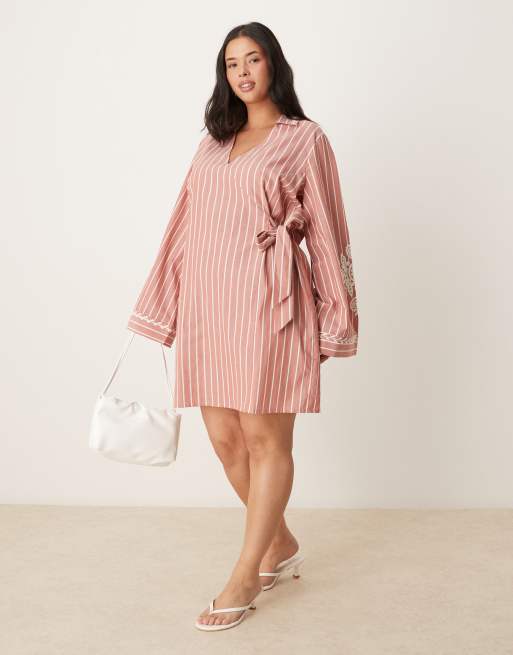 ASOS DESIGN Curve – Besticktes, kurzes Wickel-Hemdkleid mit breiten Bündchen und Streifen