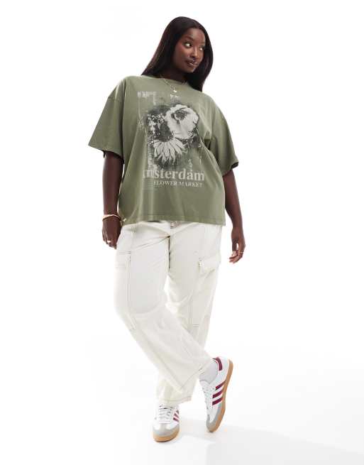 ASOS DESIGN Curve – Boyfriend-T-Shirt in Tannengrün mit „Amsterdam“-Print