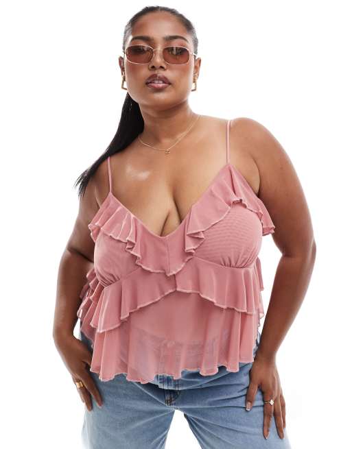 ASOS DESIGN Curve – Camisole aus Netzstoff in gedecktem Rosa mit Rüschen