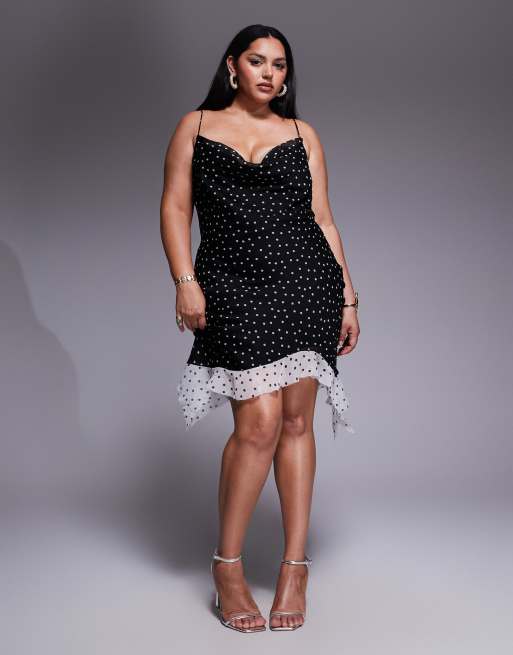 ASOS DESIGN Curve – Fließendes Minikleid mit Wasserfallausschnitt, Punkten und Kontrastsaum