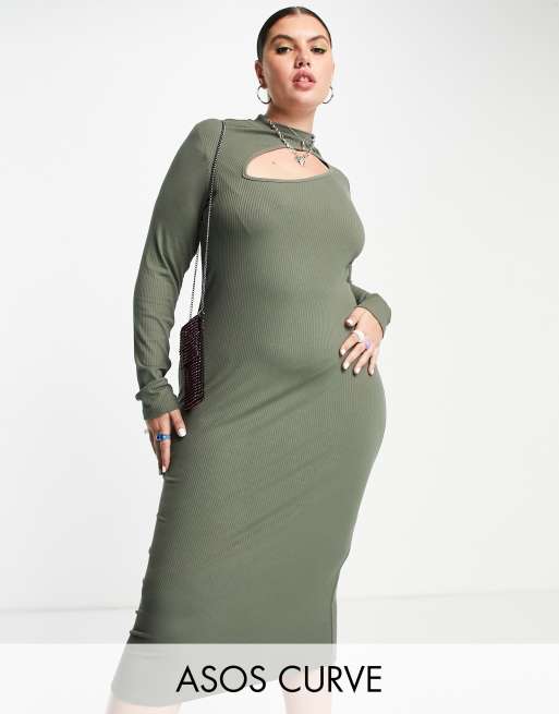 ASOS DESIGN Curve – Geripptes Kleid mit asymmetrischem Zierausschnitt und langen Ärmeln mit Daumenlöchern