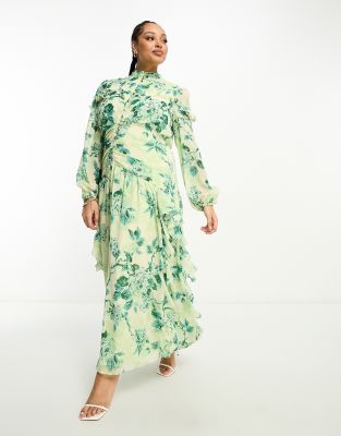 ASOS DESIGN Curve – Gerüschtes Maxikleid mit gerafftem Oberteil, Knopfleiste und Blumenmuster