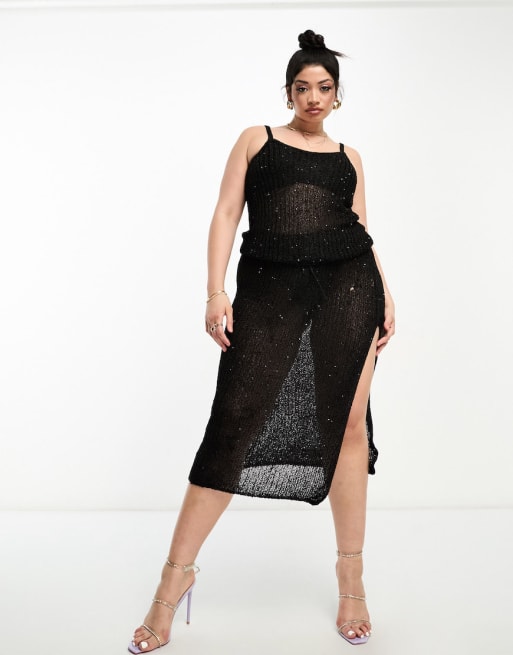 ASOS DESIGN Curve – Gestricktes Set aus Trägertop und Maxirock mit Pailletten in Schwarz