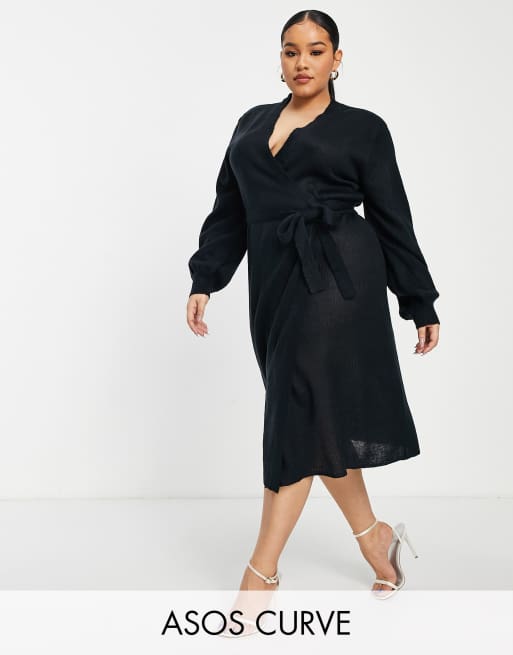 ASOS DESIGN Curve – Gestricktes Wickel-Minikleid in Schwarz mit Ballonärmeln