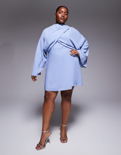 ASOS DESIGN Curve – Hochgeschlossener Playsuit in Staubblau mit Wickeldesign und Fledermausärmeln