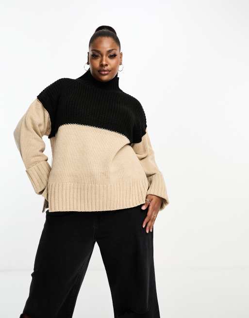 ASOS DESIGN Curve – Hochgeschlossener Pullover mit Blockfarbendesign in Schwarz und Kamelbraun