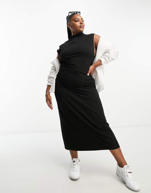 ASOS DESIGN Curve – Hochgeschlossenes, seitlich gerafftes Midikleid in Schwarz