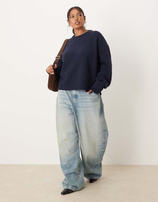 ASOS DESIGN Curve – Kastiger Pullover in Marineblau mit Rundhalsausschnitt und Seitenschlitz
