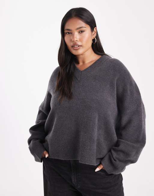 ASOS DESIGN Curve – Kastiger Strickpullover in Anthrazit mit V-Ausschnitt