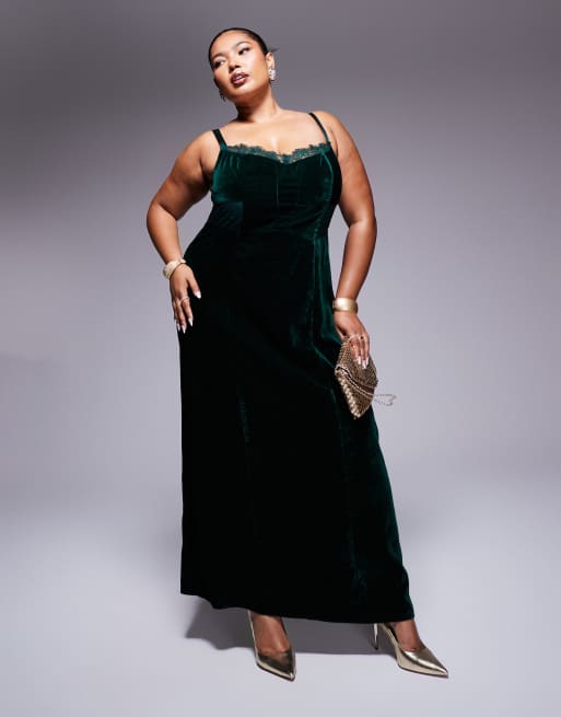 ASOS DESIGN Curve – Korsett-Midikleid aus Samt in intensivem Blaugrün mit Spitzenborte