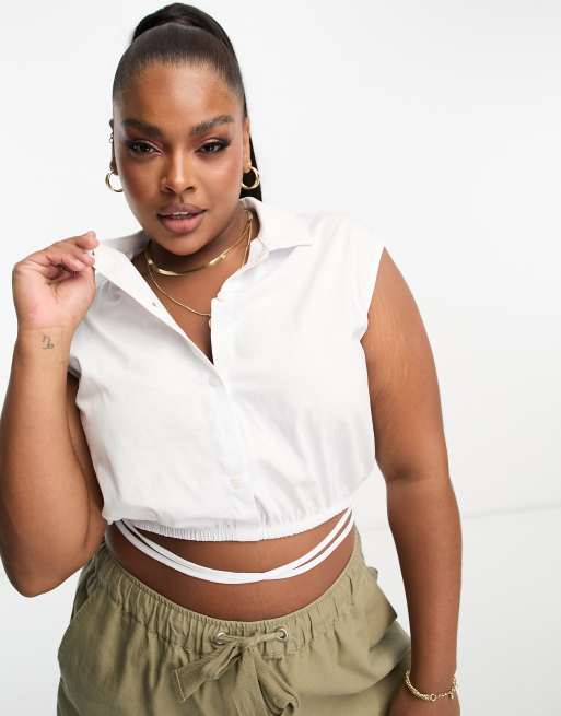 ASOS DESIGN Curve – Kurze Bluse in Weiß mit Bindeband an der Taille