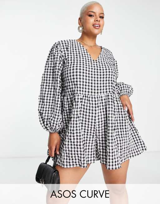 ASOS DESIGN Curve – Kurzer, gesmokter Playsuit mit Puffärmeln und schwarzem Karomuster