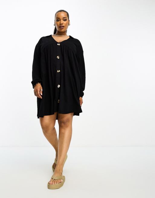 ASOS DESIGN Curve – Kurzes. langärmliges Hängerkleid in Schwarz mit Knöpfen