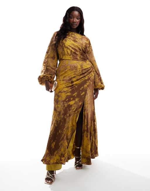 ASOS DESIGN Curve – Langärmliges, asymmetrisch geschnittenes Maxikleid mit abstraktem Ausbrenner-Muster