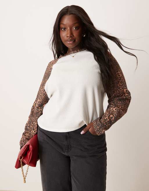 ASOS DESIGN Curve – Langärmliges T-Shirt mit Waffelstruktur und Raglanärmeln mit Leopardenmuster