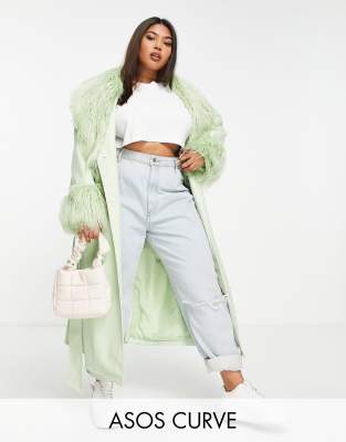 ASOS DESIGN Curve – Mantel aus pistaziengrünem Kunstleder mit Teddyfell-Besatz und Bindegürtel