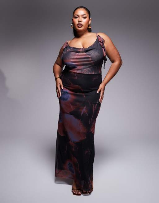 ASOS DESIGN Curve – Maxikleid aus Netzstoff mit tiefem Wasserfallausschnitt, Bindedetails und verschwommenem Blumenmuster