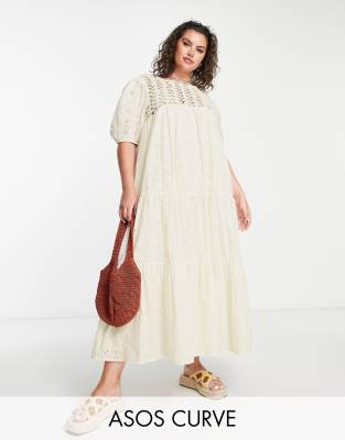 ASOS DESIGN Curve – Midikleid in Natur mit Häkeleinsatz und Lochstickerei