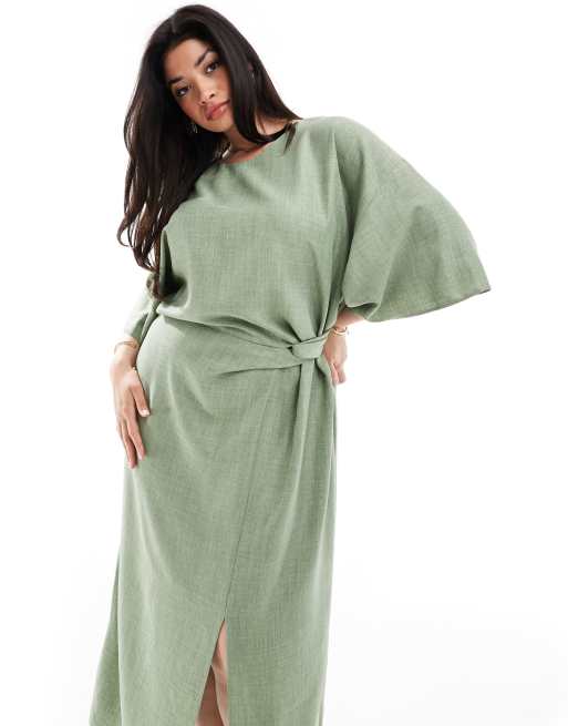 ASOS DESIGN Curve – Midikleid in Salbeigrün mit drapierter Taille und Flügelärmeln