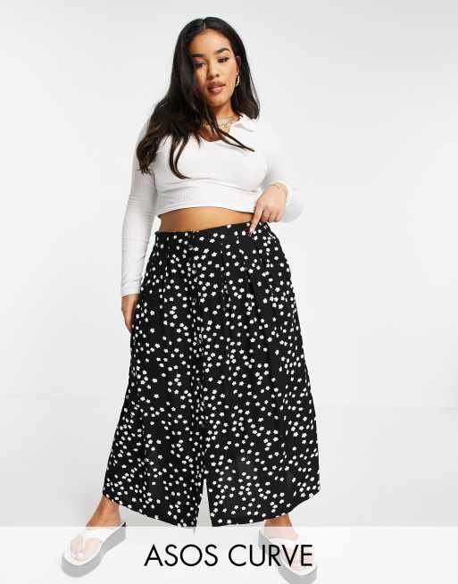 ASOS DESIGN Curve – Midirock in Schwarz mit Knopfleiste und Gänseblümchenmuster