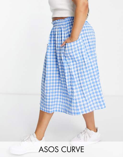 ASOS DESIGN Curve – Midirock mit Taschendetail und Vichy-Karos in Blau & Weiß
