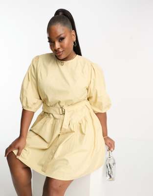 ASOS DESIGN Curve – Minikleid aus Baumwolle in Kamelbraun mit tief sitzender Taille und D-Ring
