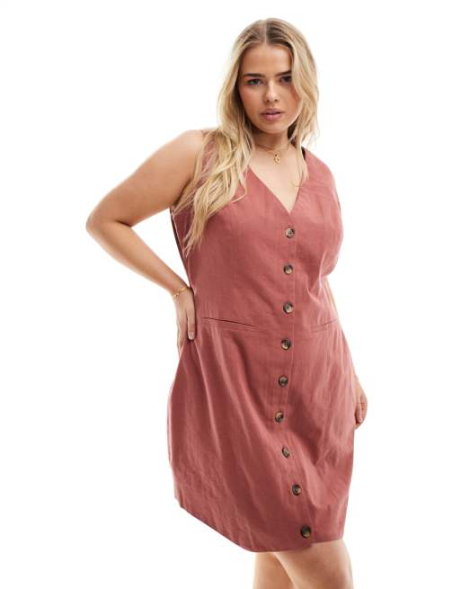 ASOS DESIGN Curve – Minikleid aus Leinen in Tabakbraun mit Westenoberteil und durchgehender Knopfleiste