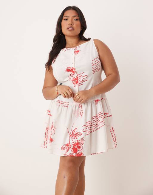 ASOS DESIGN Curve – Minikleid mit tiefer Taille, U-Boot-Ausschnitt, rotem Blumenmuster und Knopfleiste